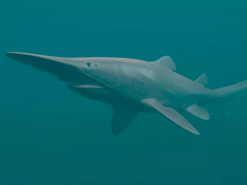 The Goblin Shark (Mitsukurina owstoni) is a rare and ancient species often referred to as a "living fossil." This deep-sea predator, found at depths of 270 to 1,300 meters, has a lineage dating back over 125 million years. Its most distinctive feature is its elongated, flattened snout, or rostrum, which is packed with sensory organs called ampullae of Lorenzini. These allow the shark to detect the faint electrical signals of prey in the darkness of the deep ocean. The Goblin Shark's protrusible jaws are another remarkable adaptation. These jaws can extend far beyond its snout to capture prey with lightning speed, aided by sharp teeth and a powerful suction mechanism. Its soft, flabby body and pinkish-gray coloration help it blend into its surroundings, making it an effective ambush predator. Despite its fearsome appearance, the Goblin Shark is a slow-moving species that relies on stealth and sensory adaptations to hunt crustaceans, cephalopods, and small fish. Little is known about its reproduction, but it is believed to be ovoviviparous, with eggs hatching inside the female before live young are born. The Goblin Shark remains a subject of fascination, providing insights into the evolution and adaptations of deep-sea life.
