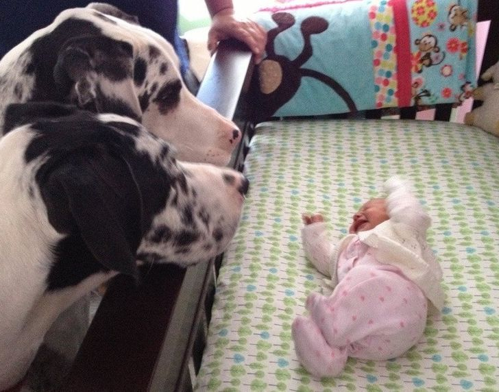 Welcoming a new family member is always special, and this picture perfectly captures the excitement of these two furry brothers meeting their baby sister. Their curious yet gentle expressions show how pets become an integral part of the family. It’s heartwarming to see how pets instinctively accept and protect new additions to the household.