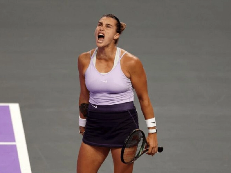 The intensity of the match is written all over her face as she prepares to serve. This image captures the mental and physical preparation required to compete at the highest level, where every point could be the difference between victory and defeat.