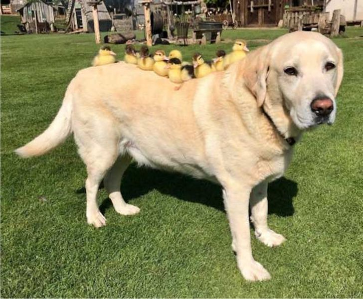 3. After the mother of nine ducklings vanished, this castle dog took them in.
