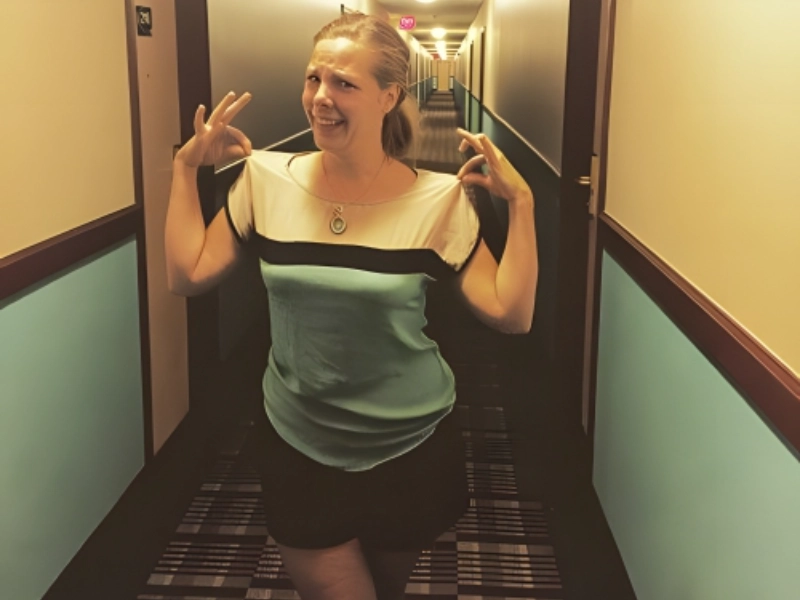 This woman noticed her shirt matched the walls of her hotel hallway perfectly. The colors and patterns are identical, making it look like she’s part of the décor.