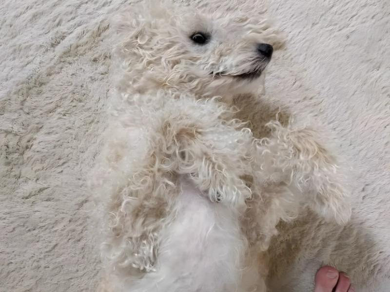 If it weren’t for the dog’s black nose and eyes, it’d be nearly impossible to spot him. Hopefully, the owner is careful not to step on him by accident!