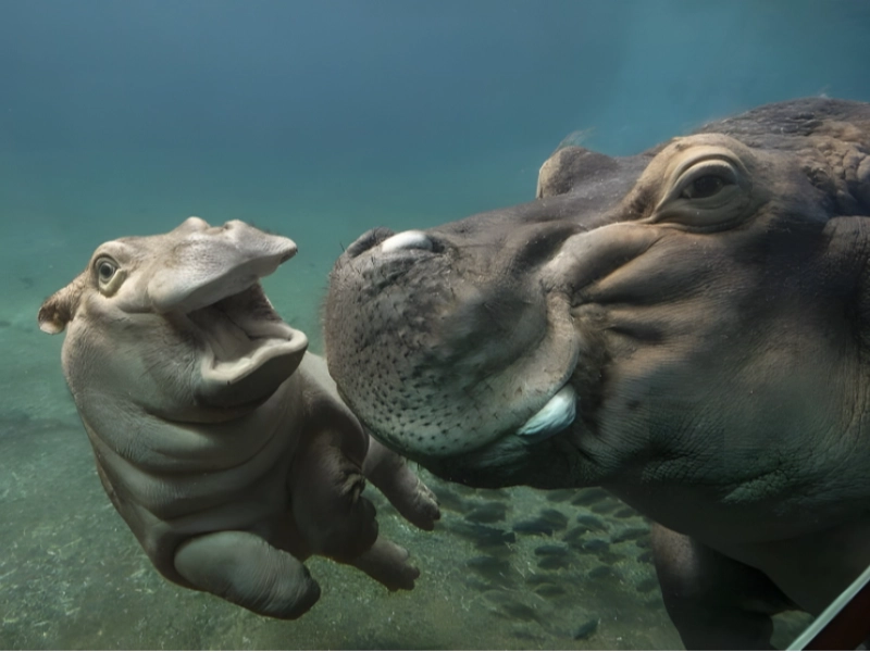 There is something undeniably touching about the bond between a mother hippopotamus and her calf. In this heartwarming photograph, the pair is captured in a moment of gentle togetherness, their massive bodies pressed close in a gesture of affection and security. The mother’s protective presence and the calf’s trust create a moving portrait of family love. Despite their size and strength, hippos are deeply social animals, and their relationships are built on touch, communication, and care. This image invites us to look beyond appearances and appreciate the tenderness that exists in even the most formidable creatures.