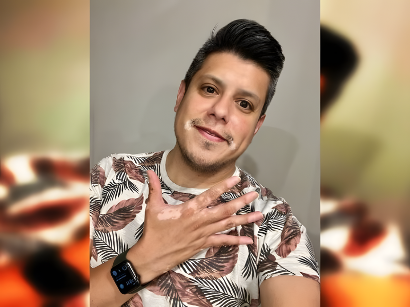 A man with vitiligo, a skin condition that creates striking patterns of depigmentation. His unique appearance is a testament to the beauty of diversity and the way vitiligo can create natural works of art on the human body. His skin tells a story of resilience and individuality, making him truly one of a kind.