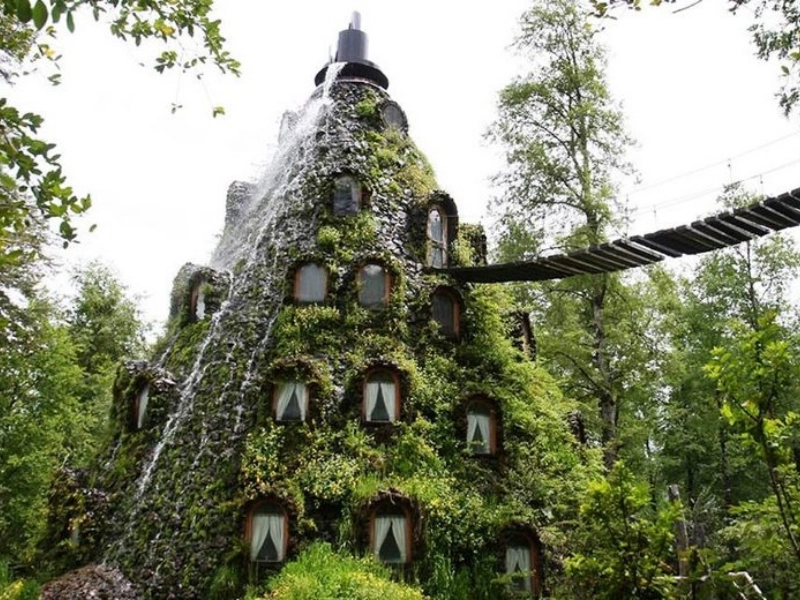 Dieses fantastische, vulkanähnliche Hotel ist im Herzen eines riesigen privaten Naturschutzgebiets versteckt und speit Wasser anstelle von Lava. Es ist nur zu Fuß erreichbar, und die Gäste müssen mutig genug sein, eine schwankende Hängebrücke zu überqueren, um es zu betreten.