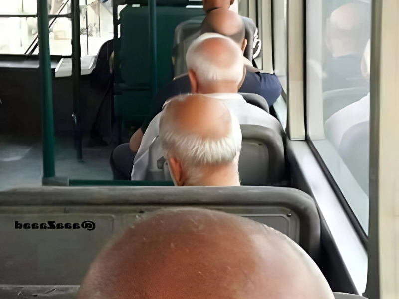 Die Tatsache, dass fünf fremde Personen mit ähnlichen, halb kahlen Köpfen einer vor dem anderen im Bus saßen, macht diese Schnappschuss zu einem multidimensionalen Ereignis. Auch wenn es nicht ganz so dramatisch wie Science-Fiction ist, ist dieses Bild dennoch großartig.