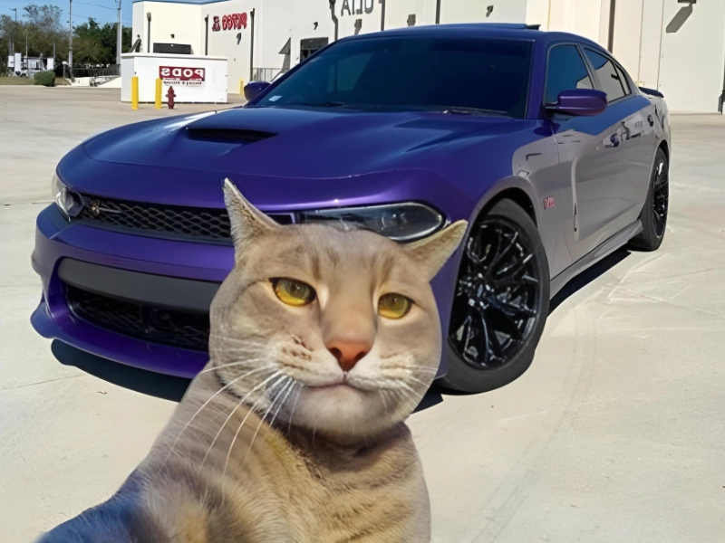 Wie so mancher Mensch auf Facebook hat auch diese Katze kürzlich ein brandneues Muscle Car erworben und präsentiert es stolz mit einem Selfie (obwohl sie, ehrlich gesagt, wohl eher jemanden belästigt, der gerade ein Foto von seinem Auto machen wollte).