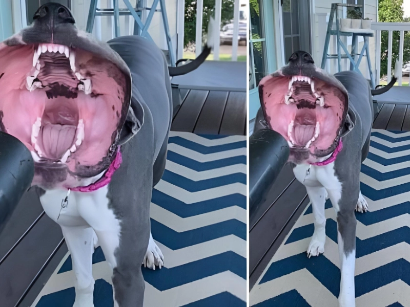Diese im perfekten Moment aufgenommene Szene zeigt, wie dieser Welpe den Demogorgon herausfordert. Sein extrem weit geöffnetes Maul (vielleicht weil er versucht, Luft von einem Laubbläser einzuatmen) lässt ihn auf diesem Foto wie ein außerirdisches Wesen erscheinen.