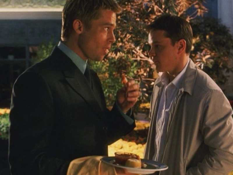 In a fascinating and surreal moment, Brad Pitt's character reaches for a glass that appears to be within arm's reach. But as soon as he touches it, something unexpected happens: the glass instantly transforms into a plate. This abrupt change blurs the line between reality and fantasy, surprising not only the character but also the audience witnessing this mysterious event.This scene could be interpreted as a metaphor for life’s unpredictability. Just as the glass turns into a plate, our expectations and goals can suddenly shift into something entirely different. Perhaps this transformation symbolizes the fragility of human perception or how our reality can change dramatically with a shift in perspective.