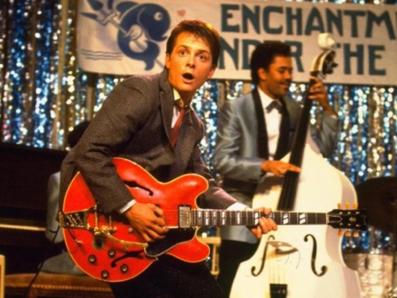 In an iconic scene, the protagonist plays a Gibson ES-345 guitar, a model released in 1958. However, the scene takes place in 1955, during his parents' high school dance. This historical inaccuracy stands out, as the guitar didn’t exist at the time.The choice to use this guitar may have been made for several reasons. Its distinctive sound and elegant design create a strong visual and auditory impact, perfectly complementing the film’s atmosphere. This highlights how artistic freedom sometimes takes precedence over historical accuracy to achieve a desired mood or effect. For viewers unfamiliar with the exact release dates of musical instruments, this minor inaccuracy often goes unnoticed.