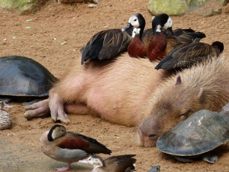 Capybaras have formed intriguing relationships with turtles in wetland habitats, often during their routine swimming and bathing sessions. These encounters frequently occur in shared basking areas, where both species coexist peacefully. Capybaras display remarkable awareness of their turtle companions, skillfully navigating around them while swimming or resting. Turtles, in turn, help by clearing algae and parasites from the submerged parts of the capybaras’ bodies, extending their cooperation to mutual grooming. This relationship highlights how species with vastly different evolutionary histories can develop cooperative behaviors when they share similar ecological niches.
