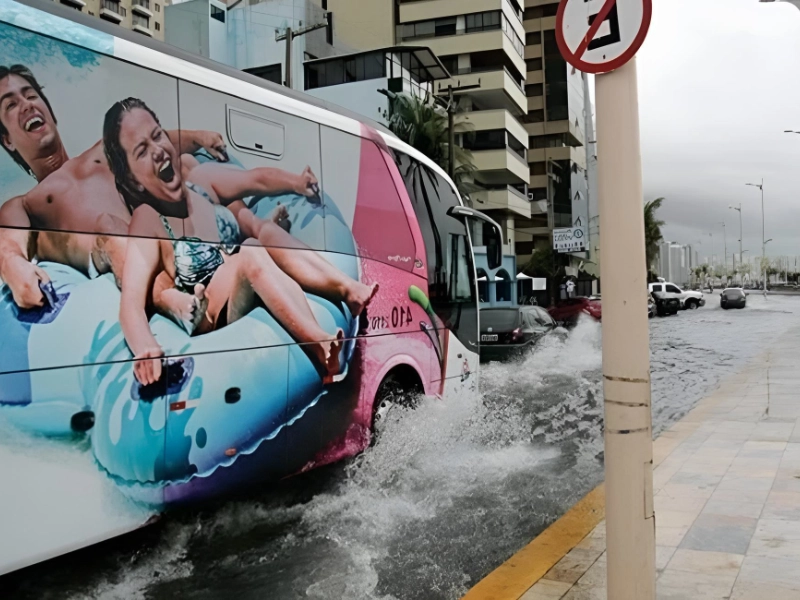 Floodwaters are among nature's most unpredictable forces, and while buses are often built to withstand tough conditions, even they have their limits. This image not only highlights the resilience of the bus but also the daring spirit of its passengers. Technically, driving through floodwaters is not advisable, but the scene humorously suggests that this bus might be doubling as a water park ride for thrill-seekers.