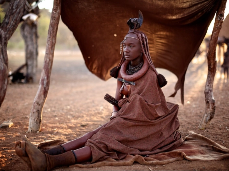 The Himba people, an indigenous group in northern Namibia, are famous for their reddish-orange skin, achieved by applying a mixture of red clay and butterfat. This practice is not only a mark of beauty but also serves as protection against the harsh sun. Himba women are known for their intricate hairstyles, which signify their age, marital status, and social standing.