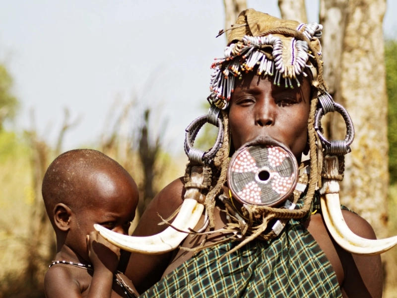 The Mursi tribe of southern Ethiopia is renowned for its unique lip plates, worn by women as a symbol of beauty and social status. This practice involves cutting the lower lip and inserting a clay disc, which is gradually enlarged over time. The size of the lip plate often signifies a woman's readiness for marriage.