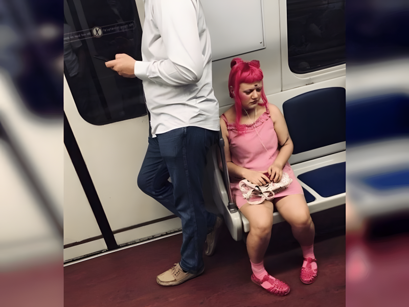 Some favorites are impossible to hide. This rider’s passion for a particular color is on full display, from head to toe. His vibrant attire is a celebration of personal taste, brightening the train and inviting smiles from everyone he passes.
