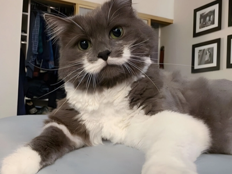 Charming Moustache: The cat’s moustache, paired with its fluffy fur and gray coloring, gives it a sophisticated air.