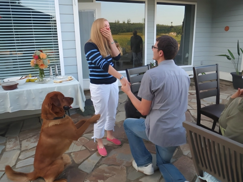 Is this dog behaving as expected? As this man proposed to his girlfriend, their dog joined in, almost as if asking for a ring, too. This moment is truly one-of-a-kind. Anyone would be charmed by this dog’s innocent request. The man must have taught his loyal companion well. Now, his best friend has become his best wingman. Looking again, maybe the dog is just waiting for his own proposal from the groom.