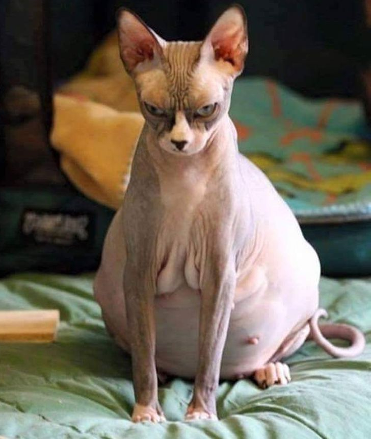 In a busy city apartment, a hairless Sphynx cat named Cleopatra faced an unexpected surprise – she was pregnant. Known for her graceful charm, Cleopatra had never imagined becoming a mother. As her belly grew, she became the center of attention, with her humans joking about her soon-to-arrive hairless kittens. Cleopatra embraced her new role with curiosity, often lying on her back and rubbing her belly as if talking to her babies. When the time came, her humans were ready, and one by one, her adorable, wrinkled kittens were born. Cleopatra cared for them with patience and love, teaching them every step of the way. Her kittens soon became the talk of the neighborhood, admired by all who saw them. Her surprise pregnancy brought her joy and pride, and her unique family became a source of delight for everyone.