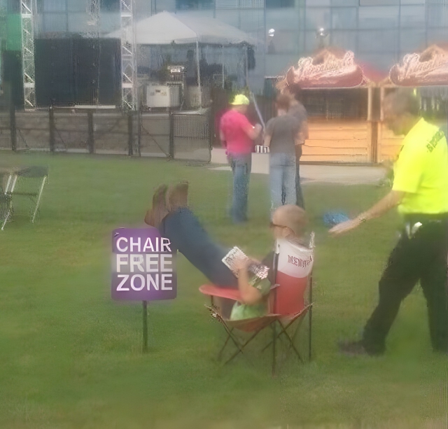 私たちが住む世界では、ルールに従わなければなりません。従わなければ、結果が伴います。しかし、ルール違反を構成する要素について人によって解釈が異なるため、境界線を引くのが難しい場合があります。この場合は、あえて反対意見を述べます。この写真は、警備員が彼を「椅子禁止区域」に座らせたとして逮捕する直前に撮影されたものであることは認めますが、疑問に思わざるを得ません。