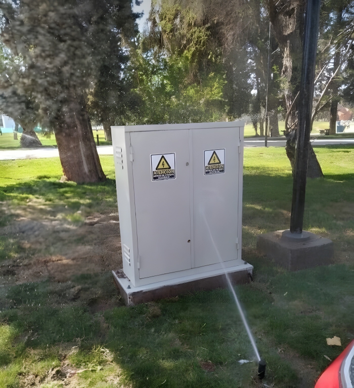 水と電気を混ぜてはいけないことは、通常言うまでもないことですが、このスプリンクラーの設置者はその点に気付いていなかったようです。ここで何も問題が起きなかったことを祈ります。
