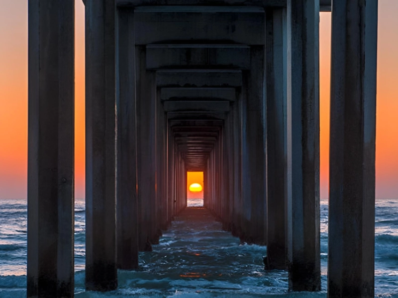 Capturing a Stunning Sunset Photographing a sunset can be challenging, but this image beautifully captures its brilliance. Twice a year, the sun aligns perfectly with Scripps Pier in La Jolla, California. Photographer John H. Moore managed to seize this rare alignment, standing out among many who try to do the same. His skill makes this sunset scene truly remarkable.