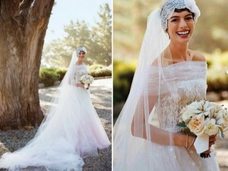 Anne Hathaway’s Romantic Valentino Dress Anne Hathaway chose a Valentino gown for her wedding, radiating romance and femininity. The soft pink train and lace veil added a dreamy touch, while the delicate details showcased her refined taste and timeless elegance.