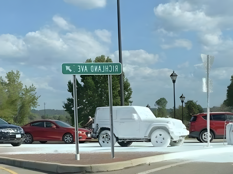 A car sits helplessly trapped in a construction zone, a perfect example of bad timing. Fresh concrete has been poured all around, and the car is now stuck, looking like a fossil in the making. Construction workers gather, puzzled about how to deal with the situation. The concrete is already hardening around the tires, turning the car into an accidental art piece. Yellow caution tape flutters nearby, drawing even more attention. This scene is a vivid reminder to heed construction signs, as ignoring them can lead to costly mistakes—and perhaps one of the most expensive parking errors in recent memory.