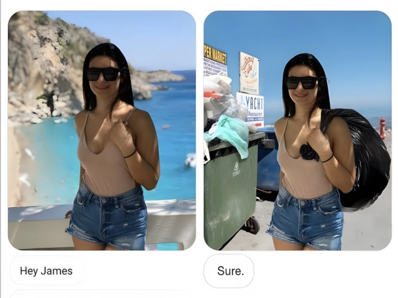 One technique to ruin a picture that seems quite perfect is this. She asked that she be seen carrying a bag over her left shoulder, but she left out the type of bag. That would be a mistake since she was photoshopped clutching a garbage bag. Not only that but the beach was furnished with garbage cans and signs to help it fit in better with the rest of the picture.