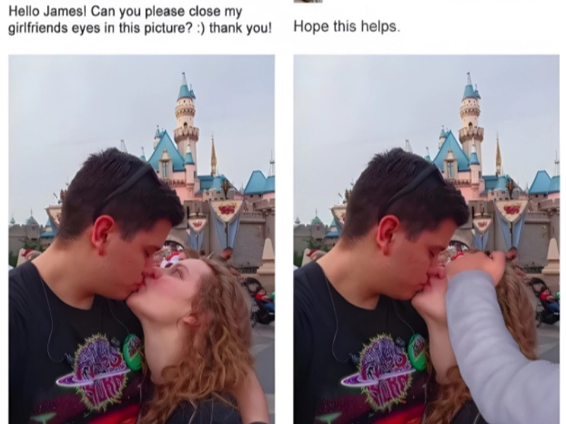 Mostly everyone should follow a few basic guidelines, and one of them is to always close your eyes when you kiss. It's simply a little bit eerie; nobody wants to seem like that oddball kissing while eyes open. It's also very funny. Although we don't believe this is what the man in this picture had in mind, he asked that his girlfriend's eyes be photoshopped closed.