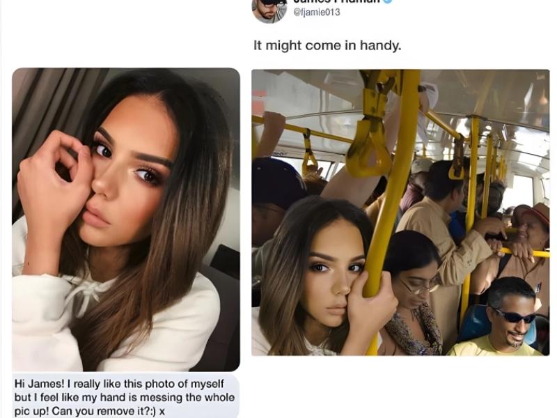 This list includes some "weird" hand pictures; we have never seriously considered hands ruining pictures before now. The girl in the picture on the left did, though, and expressed dissatisfaction with the way her hand appeared. Rather, she sought something to do with it, and she exactly found what she needed. She boarded a packed bus, and in the second picture her hand seems more at home.