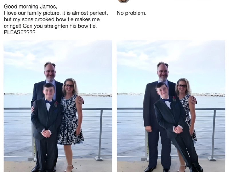 The son's bowtie is straight now, but he is actually floating in the air like he is going to be rocket launched into the heavens. Either so, or he is under possession.