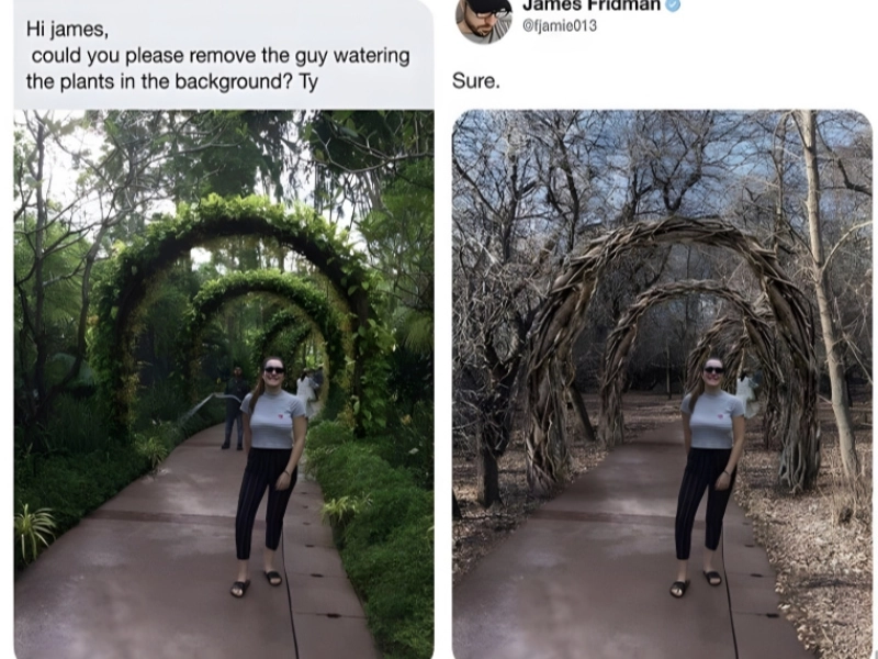 If you look closely enough, you might find a message buried somewhere in this picture. The girl in the picture wants him taken off, and there is a man tending to plants in the backdrop. But you will inevitably get the picture on the right when you remove the man tending to plants. Everything is lifeless; to be honest, it kind of reminds us of our home gardens.
