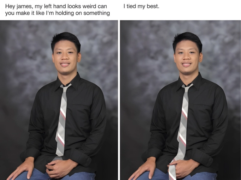 More embarrassing than this guy's hand in the left photo? Yes, his hand is visible on the right side of the picture. He essentially asked for his left hand to grip something and look less awkward. Though it doesn't look much less awkward, it is holding something in the picture on the right. If anything, we find it hard to look away from it now. At least with the first picture, you might have overlooked it.