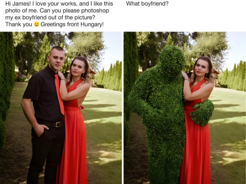 It's quite clever since the man-shaped bush the guy photoshopped into the image is simply perfect. Her ex is no longer with us, yet her stance still makes sense even if the reason she is clutching a tree is somewhat nebulous.
