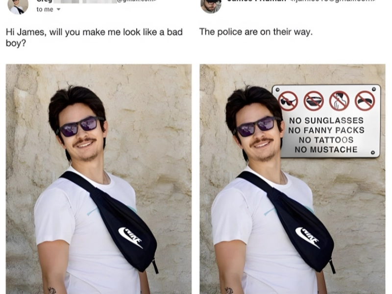 Every time he asked to be photoshopped into a "bad boy," this man understood what he was doing; the fanny pack and unicorn tattoo speaks volumes. Hence, a sign stating that he was essentially wearing banned almost everything was added. When he received the changed picture, he also received a notice indicating the cops were on route. We would believe it as well. This man was deliberately disobeying every regulation of that establishment.
