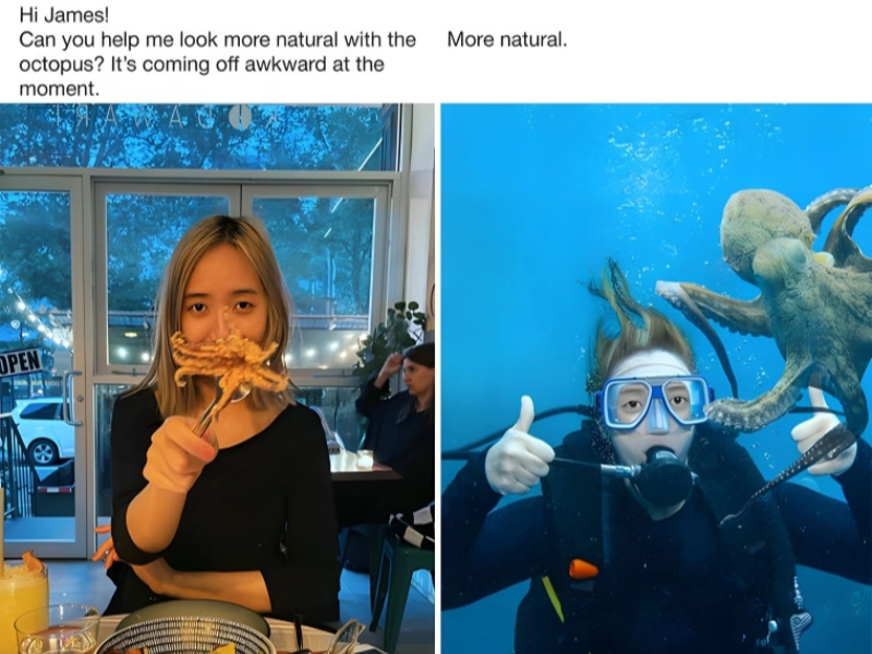 This one is rather an improvement when compared to some of the other pictures on this list. This girl requested edited images to seem more natural and less embarrassing. And, apart from vegetarians or vegans, there isn't much wrong with the left-facing picture. She was therefore just photoshopped in a scuba diving suit lounging about with what we could only guess is a much different octopus.