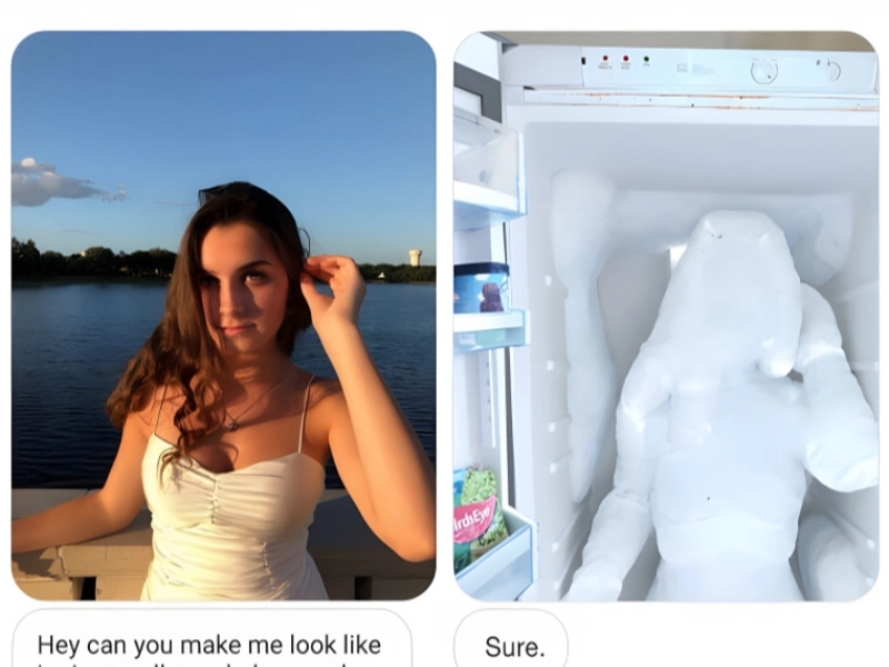 Remember, they often say, what you wish for is something else entirely. This teenager asked for her background to be changed to something "cooler". We find a lake to be really beautiful, but we suppose she had other ideas. She finally found herself photoshopped into one of the coolest places on Earth—a freezer. That is what they call poetic justice. Or is it irony instead? In any case, the right-oriented picture is fantastic.