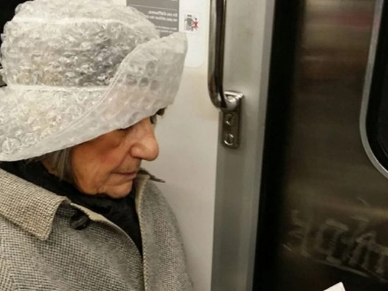 Stress-reducing headgear. Sometimes, a little comfort goes a long way during a hectic commute. This individual’s inventive headgear, designed for relaxation, offers a quirky solution to the stresses of public transportation and sparks curiosity among fellow travelers.