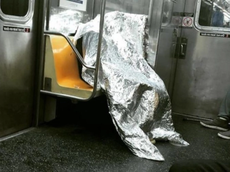 A person covered in foil. Wrapped head to toe in shiny foil, this commuter looks like they have stepped out of a science fiction film. Their creative attire turns the carriage into a stage for performance art, leaving others both amused and bewildered.