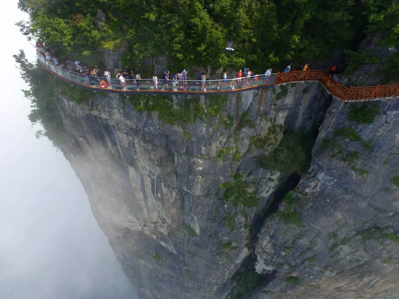 The path is about three feet (0.9 meters) wide and stretches 200 feet (61 meters) across the cliff, hanging 4,700 feet (1,430 meters) above sea level. The transparent glass floor lets visitors look straight down, heightening the thrill. Built with strong, layered glass, the walkway is designed for safety despite its daring appearance. The Skywalk adds to other nearby attractions, making Tianmen Mountain a top spot for those seeking both beauty and adventure.