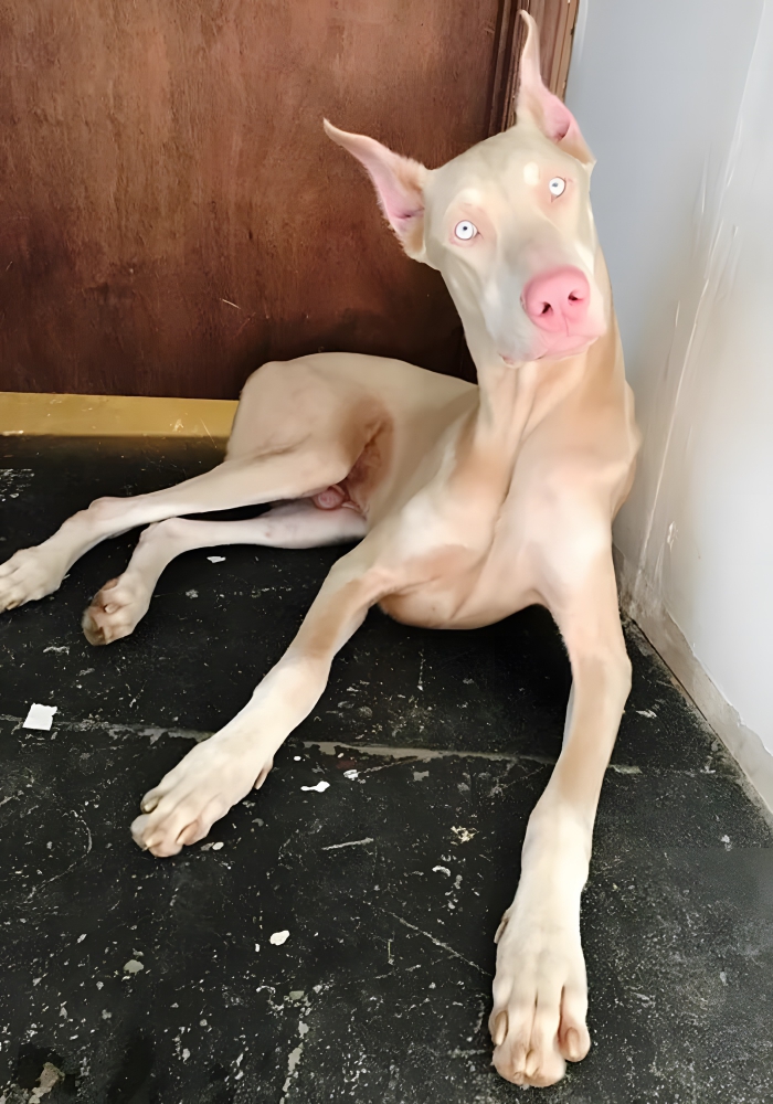 Meet Spade, an extraordinary albino Doberman. Unlike the usual chocolate-brown Dobermans, Spade has a golden cream coat and striking pale blue eyes. Have you ever seen a Doberman without its classic dark coloring? Spade’s unique appearance makes him stand out and could easily earn him a spot as a pet model. Albino dogs, who lack pigment, are extremely rare, making Spade even more remarkable. While some albino dogs still have a hint of color, Spade’s look is truly one-of-a-kind. With his stunning style and playful spirit, Spade is a joy to be around. Whether he’s running outdoors or relaxing at home, Spade represents the beauty of diversity among dogs and reminds us that every pet is unique.