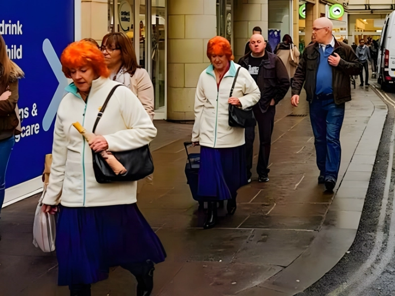 These two women seem to be strangers as they walk apart, but they have identical orange hair, wear the same boots, and are dressed exactly the same.