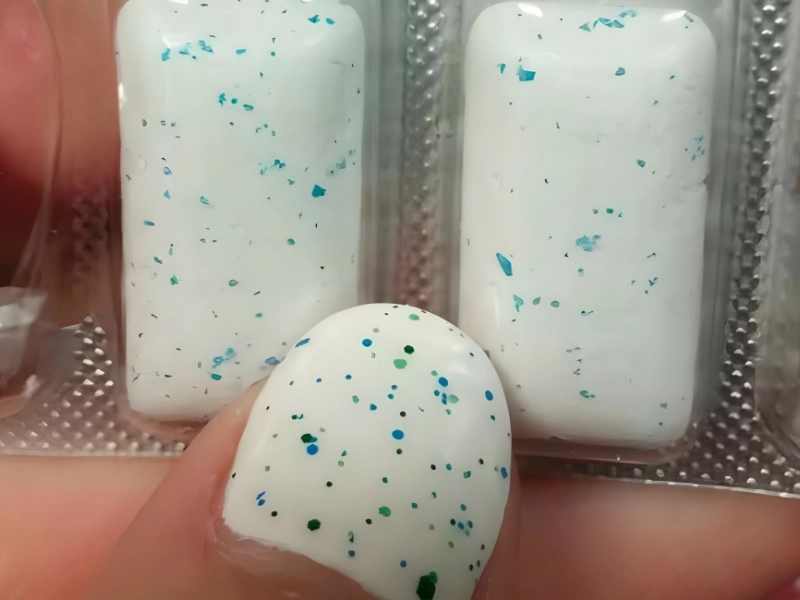 When this person opened a pack of gum, they discovered their white-painted nails with blue and green specks matched the gum exactly.