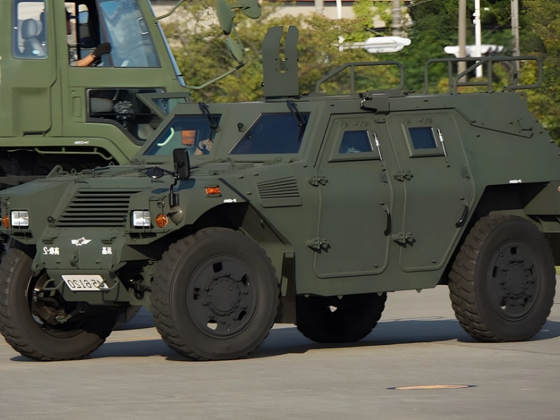 The Komatsu LAV (Light Armored Vehicle) was first produced in 2002 for the Japan Self-Defense Force. Similar to the French Panhard VBL, it features four doors and a larger cabin for troop transport. The Komatsu LAV debuted during humanitarian missions in Iraq, offering improved protection against small arms fire compared to other Japanese military vehicles.